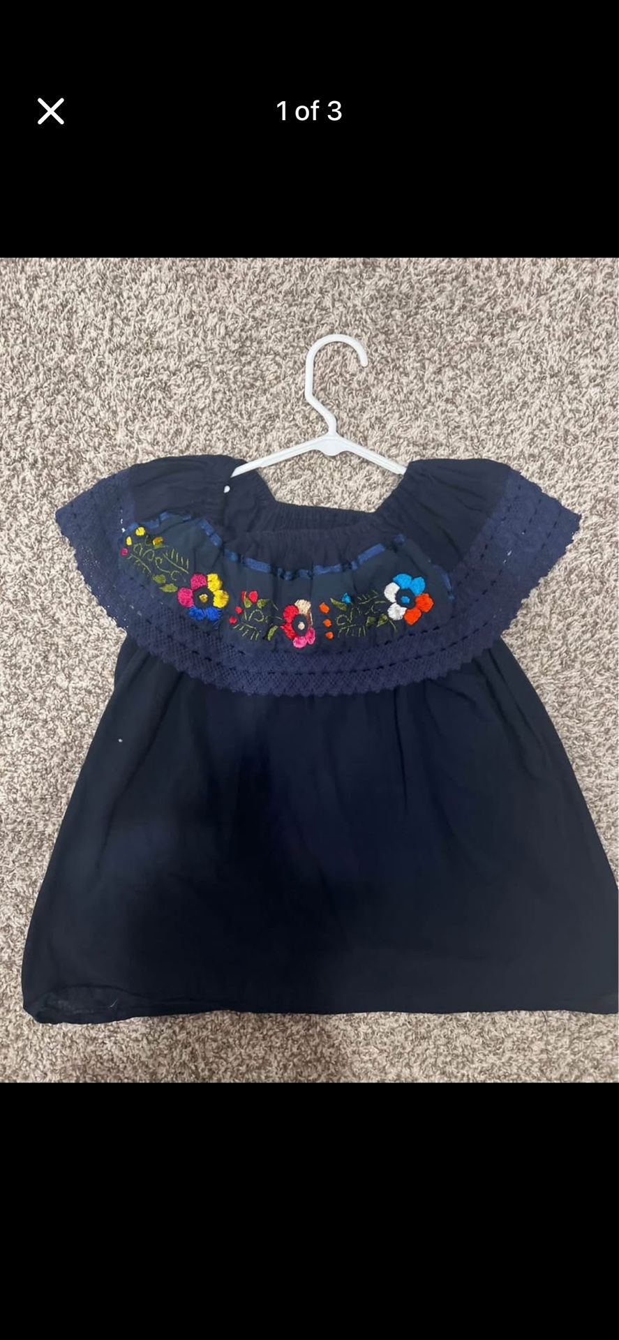 Medium/Large size Runs small bc Mexican clothes are smaller Navy color with colorful flowers blouse