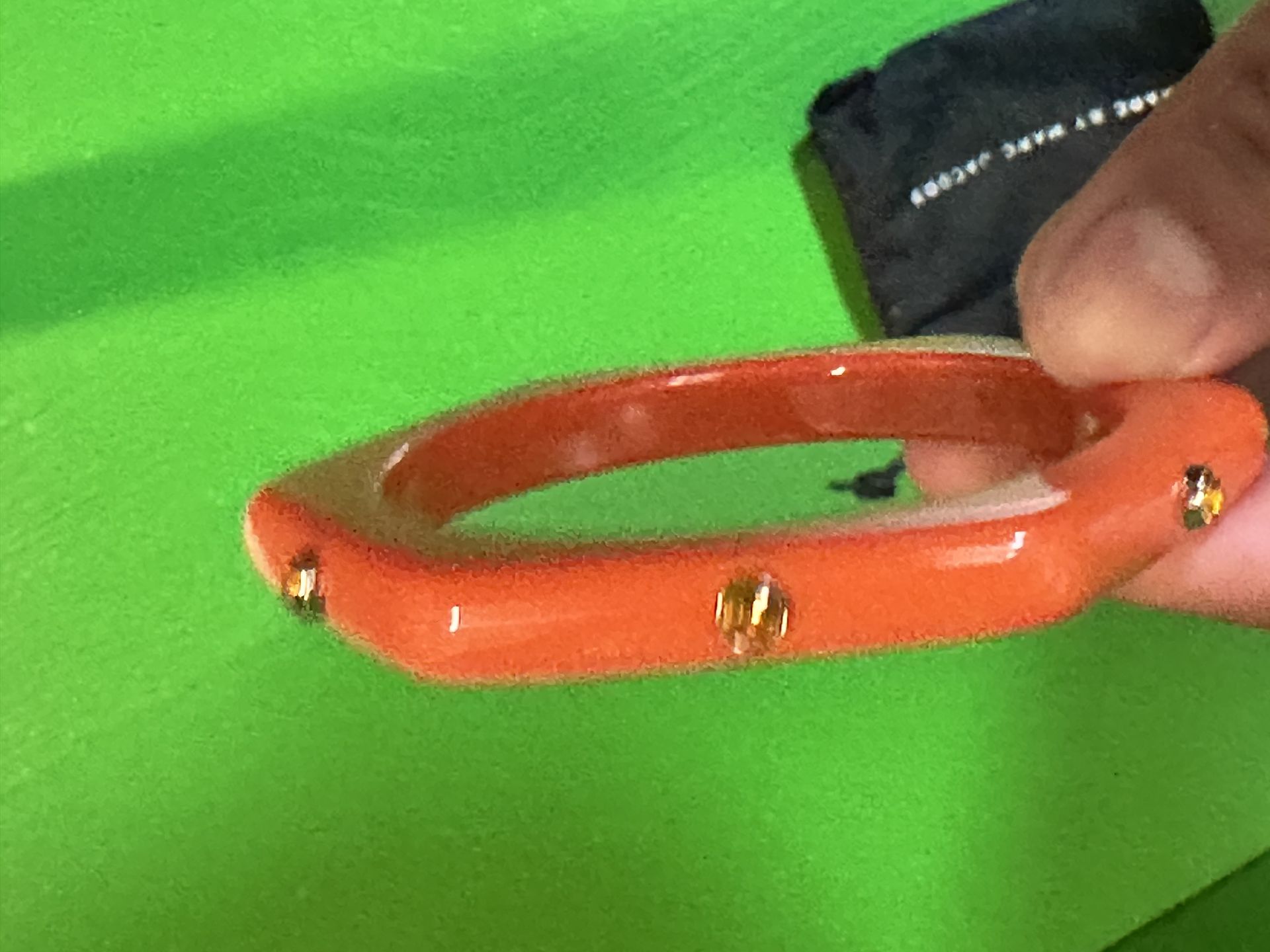 Authentic Marc Jacobs resin bangle bracelets in bold coral/orange and bright yellow. Features: • Gold-tone stud detailing • Unique geometric hexagon shape • Lightweight statement design • Includes original Marc Jacobs dust pouch Perfect for summer styling, stacking, resort wear, or adding a bold pop of color to a neutral outfit. Both in very good condition. Studs are secure and shine beautifully. 💰 $100 for the pair (open to reasonable offers) 📍 Local pickup preferred