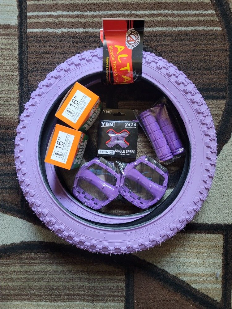 READ: if you have no intent on buying don't message. Will be blocked & reported Purple parts bundle all new $75 firm for the lot Brand new mix or match 2 solid purple 16x2.125 tires $40 16" inner tubes $12 Purple chain $15 Purple grips $8 Purple pedals $20 I can also install everything for a small fee Other colors available check my other listings