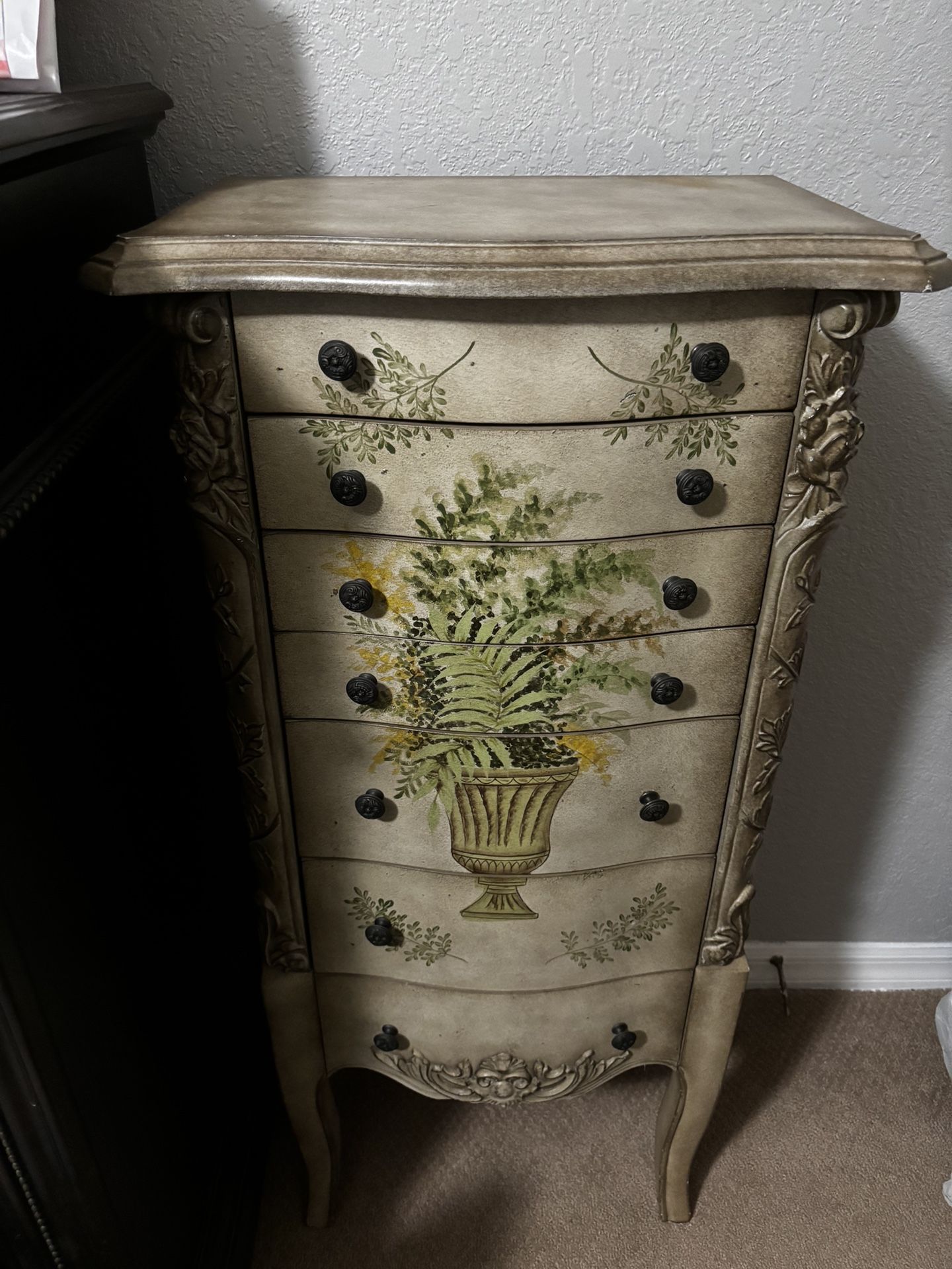 This item can be used as a jewelry drawer or for any kind of storage as it contains multiple types of drawer layouts. The top opens and has a mirror which contains a small crack but other than that, it is in great condition with beautiful artwork and sculpted moulding.