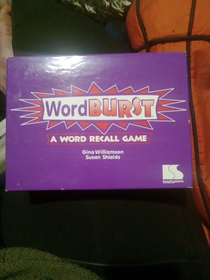 Wordburst, fun family, game, this game is brand new, but kept in storage, box may have slight imperfections, but doesn't affect the game in anyway. Game sells for $40,00, was $35.00 when it was purchased!