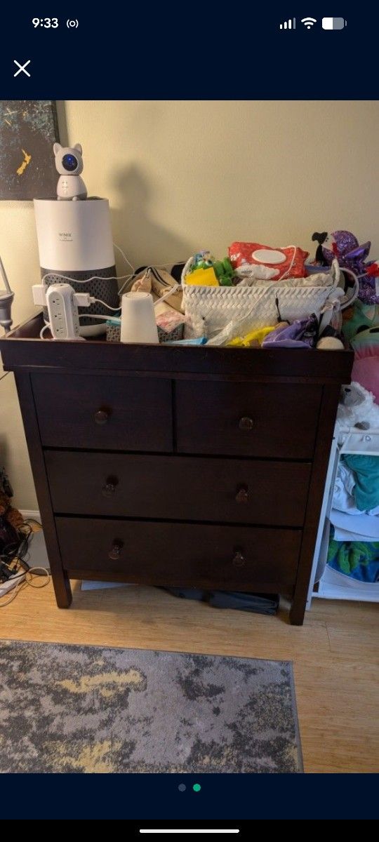 Great dresser with 4 deep drawers. Has a cushion table attached that can be removed. Great condition. Has a matching bed too