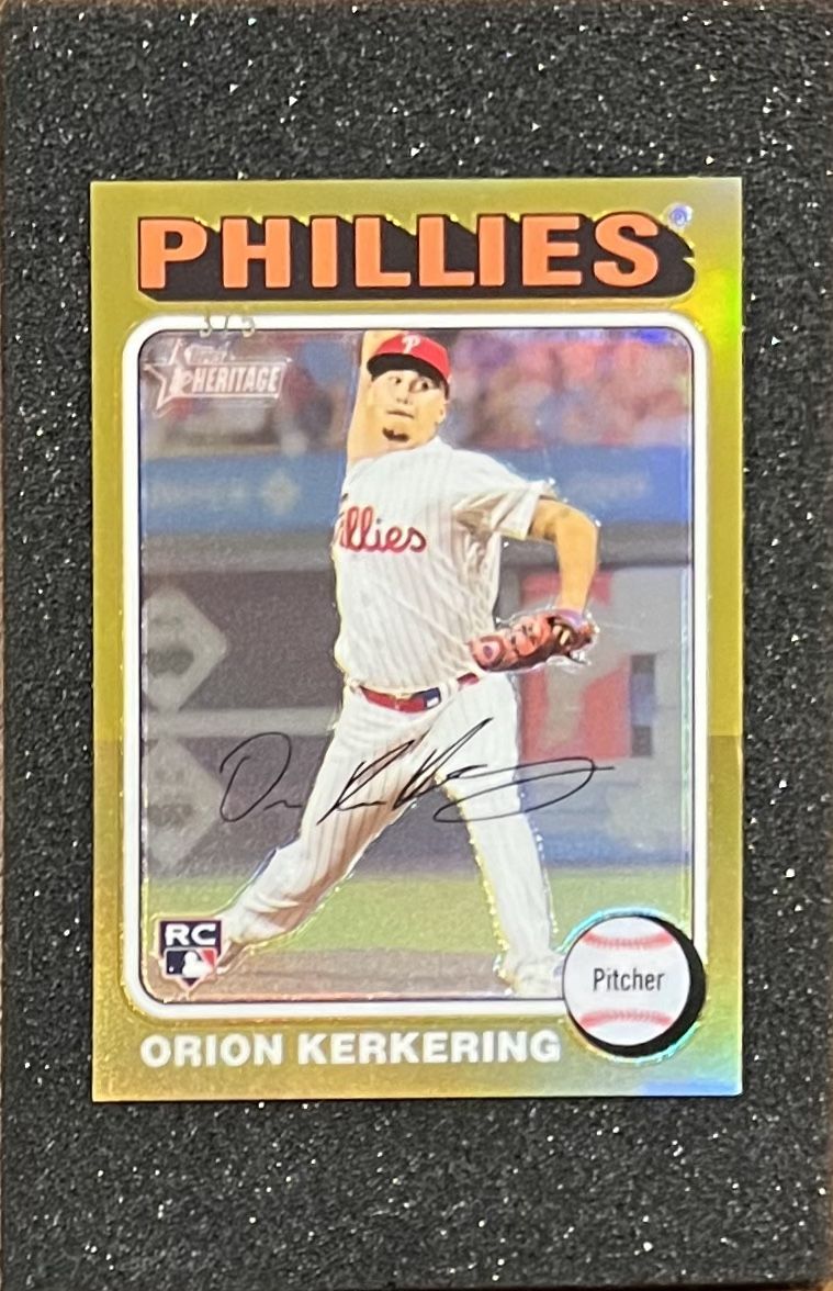 This pack fresh card is a rare and highly sought after 2024 Topps Heritage High Number rookie card featuring Orion Kerkering. This particular card is a GOLD parallel with a limited print run of only 5, making it a highly valuable and collectible card enthusiasts. It is a unique addition to any sports card collection, especially for fans the Philadelphia Phillies.