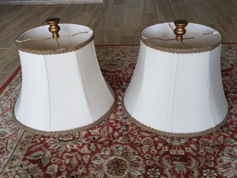 Lampshade (custom made) Purchased from an interior designer Bell shaped: 11 inches top opening 17 inches bottom opening 12 inches height 2 matching available ($25 each) Double lined Silk Light cream color With accent trim **Matching finial included** Excellent quality Brand new/never used