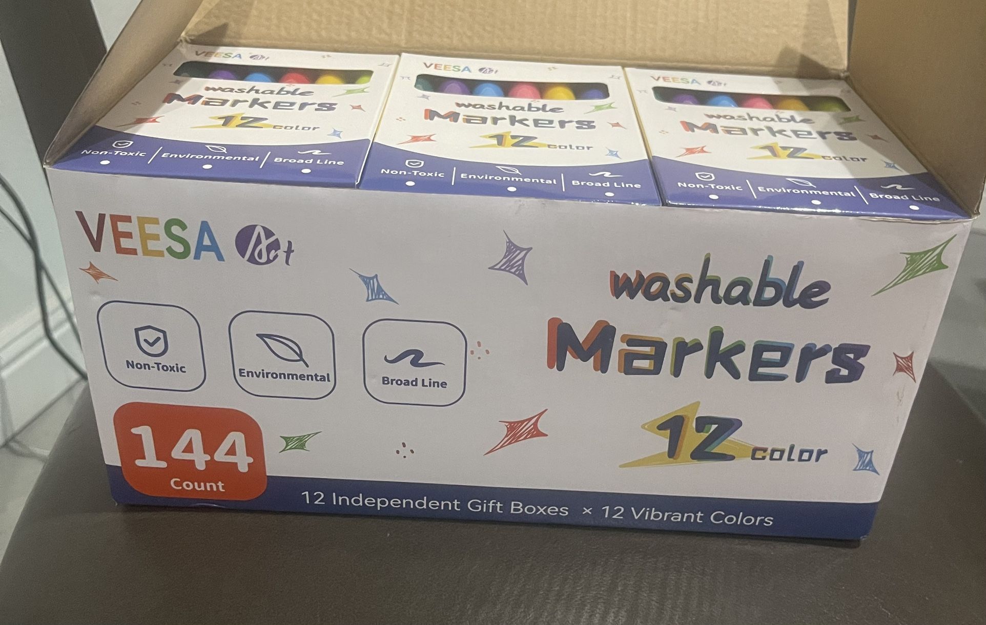VEESA Washable Markers Bulk - 12 Boxes of 12 Vibrant Colors (144 Total) - Broad Line Markers for Kids, Teacher, Classroom Must Have, Christmas Gift Safe & Washable Formula: Non-toxic, AP-certified washable markers for kids ages 3+ — the ink easily washes off skin and clothes with water, enabling worry-free creativity