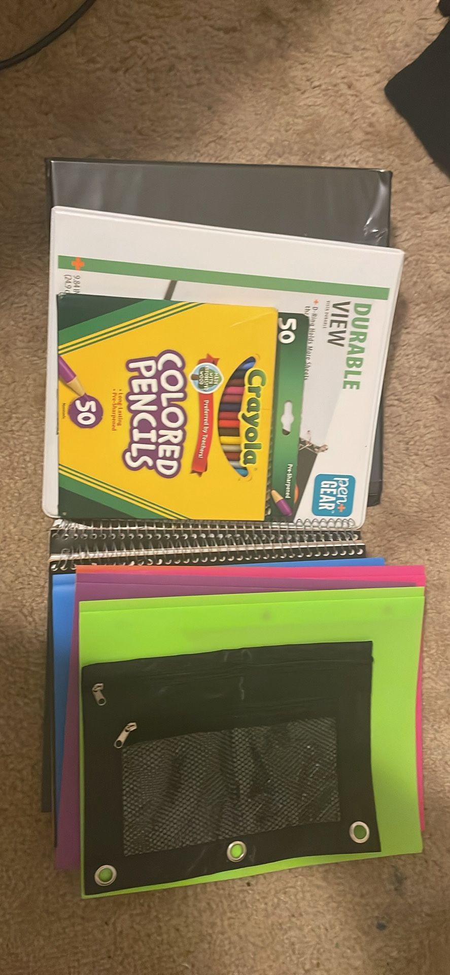 1 Box of Colored Pencils 1 Pencil Sharpener (NOT INCLUDED IN PHOTO) 1 Calculator (TI-30Xa) (NOT INCLUDED IN PHOTO) 1 Pencil Bag 2 Notebooks 2 Binders 5 Highlighters (Yellow, Green, Blue, Pink, and Orange) (NOT INCLUDED IN PHOTO) 5 Folders