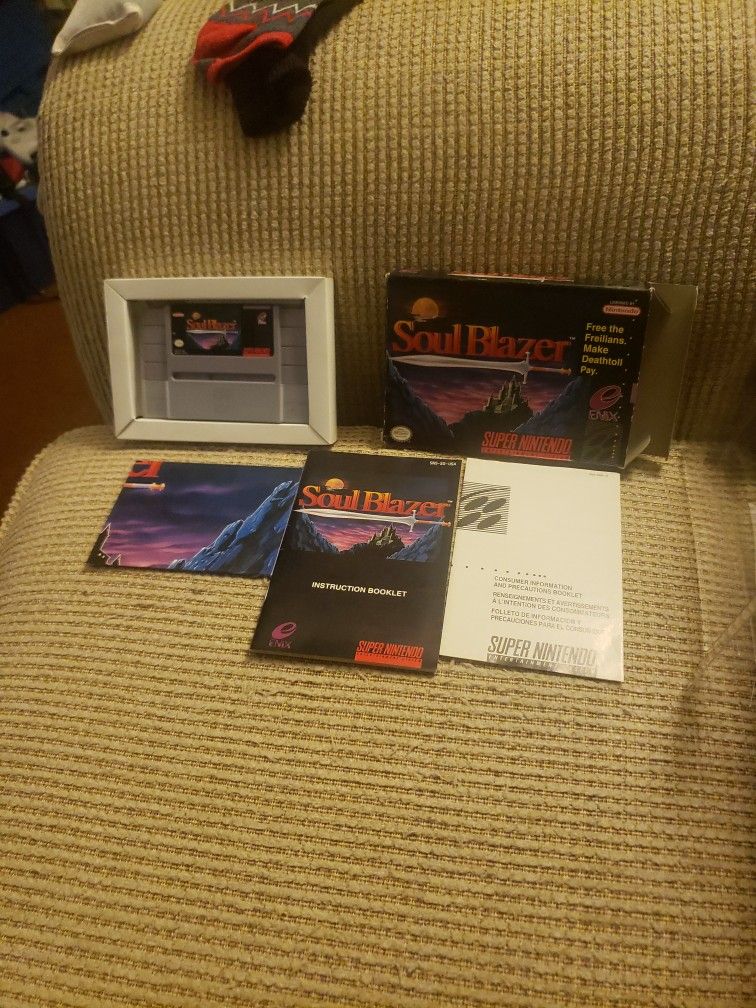 Very good condition copy of Soul Blazer for snes. Comes with: 1. Soul Blazer Cart 2. Box 3. Manual 4. Map/poster 5. Insert 6. Protective case