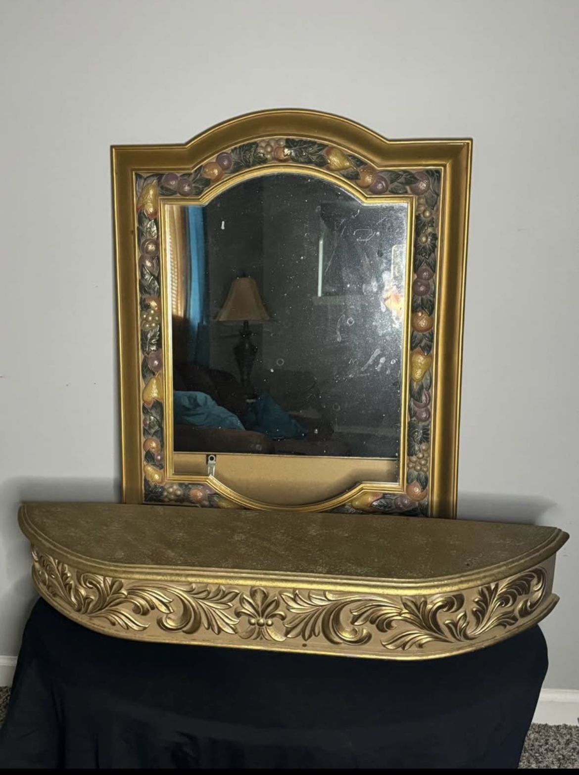 Add a touch of rustic charm to your home with this beautiful vintage wall mirror. Featuring a unique arched top and bottom design, this mirror is framed with a richly detailed fruit and leaf motif in warm, earthy tones. The outer frame is finished in a classic antique gold color, giving it an elegant yet cozy Italian countryside feel. Perfect for kitchens, dining rooms, entryways, or anywhere you want to add a decorative statement. The mirror itself shows some signs of age with minor clouding and a few small marks, adding to its vintage character. Details: • Approx. Dimensions: 27" H x 22" W • Material: Resin/wood composite frame with painted details • Style: Tuscan / Country / Mediterranean • Condition: Good vintage condition; some surface wear on the mirror consistent with age • Ready to hang (hanging hardware not included) A standout piece for anyone who loves vintage decor, Mediterranean aesthetics, or unique wall accents.