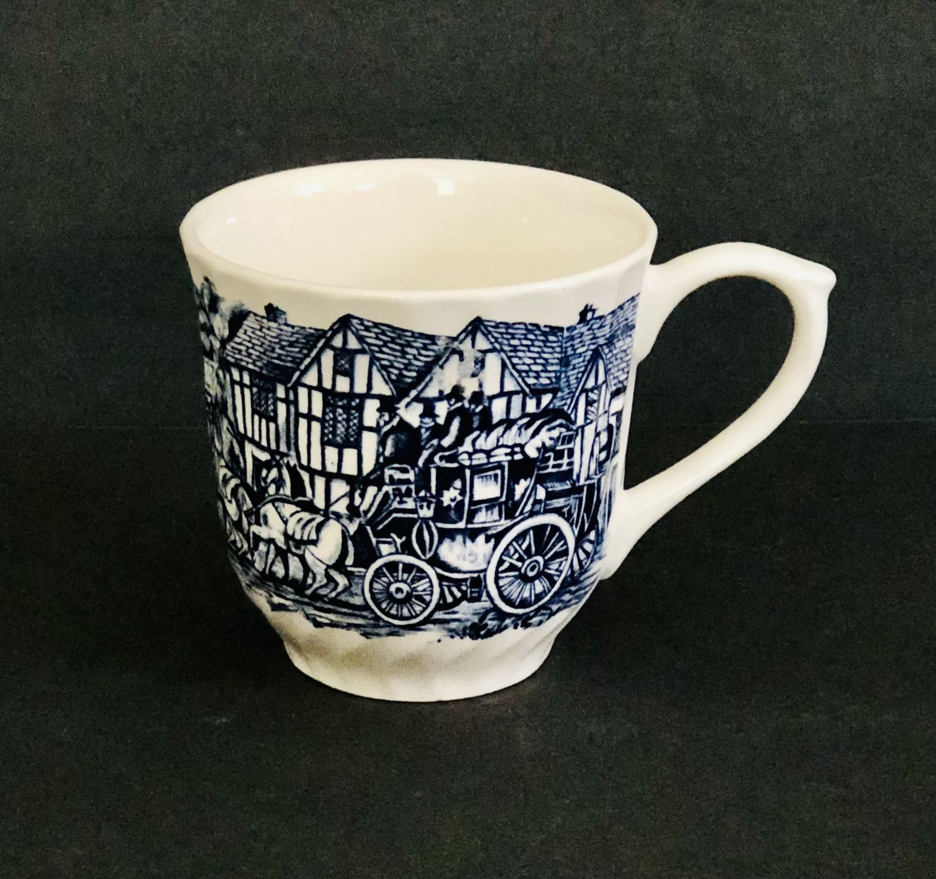 Vintage Royal Stafford Stagecoach Coaching Scene Flat Cup White Blue. Vintage. Made in England flat cup mug with stylish handle. Royal Stafford white and blue with Stagecoach Coaching Scene Horse Drawn Carriage. In excellent good condition. No chips or cracks. RARE. Fast Shipping.
