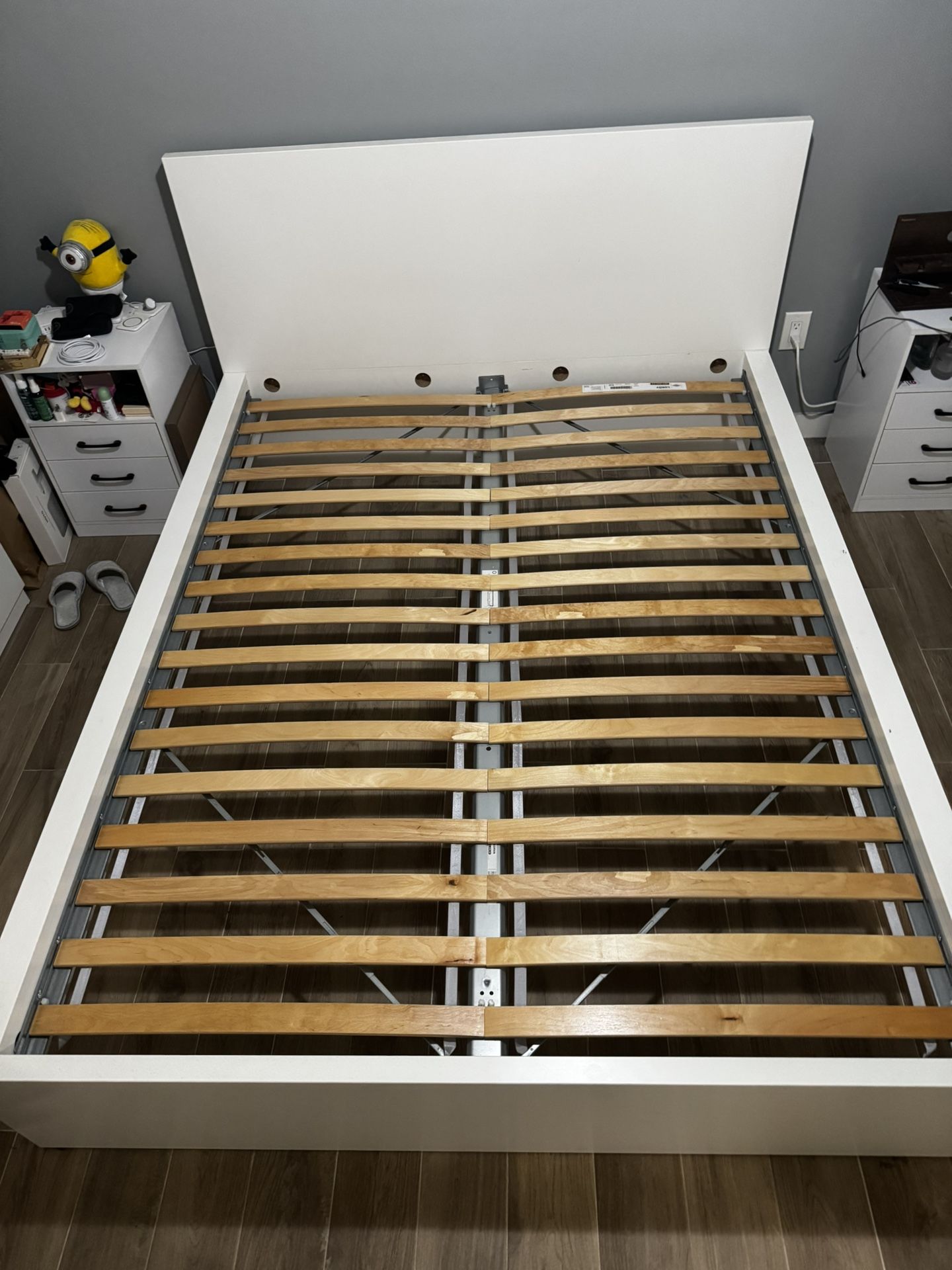 Used IKEA bed frame size queen, sold as is. Used but in great condition comes with all hardware and bed slates.