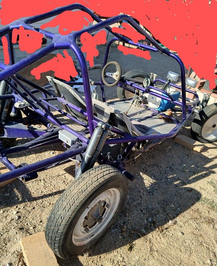 This rail has everything brake lines,pedals,brakes both sides,shifter,lights,front end is straight never rolled,not bent,broken or damaged.has the engine cage, I'm willing to let it go, I bought it from someone that pulled the engine and put in a four seater.transmission engine tank is needed and you should be ready to roll,pink slip comes with purchase thank you for looking.
