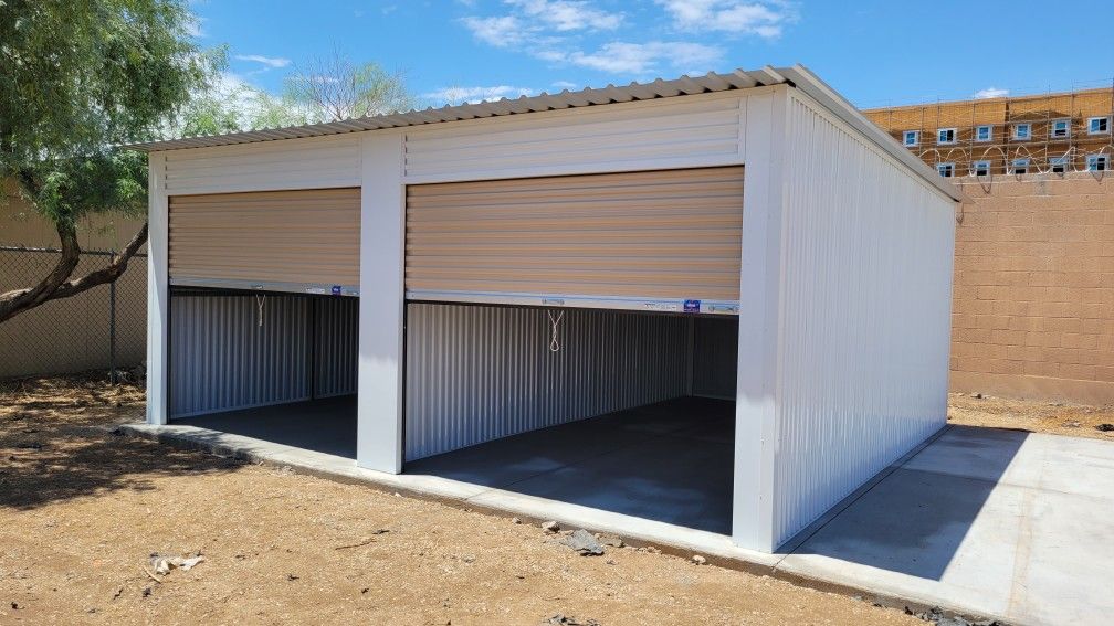 Built on-site metal buildings Height Size from 8'4"-10' Width×Depth 8×6ft 8×8ft 10x8ft 10x10ft 12×10ft 12×12ft 18x10 Custom sizes Available Biggest I built is a 20×20 Sheds come with a roll up door.