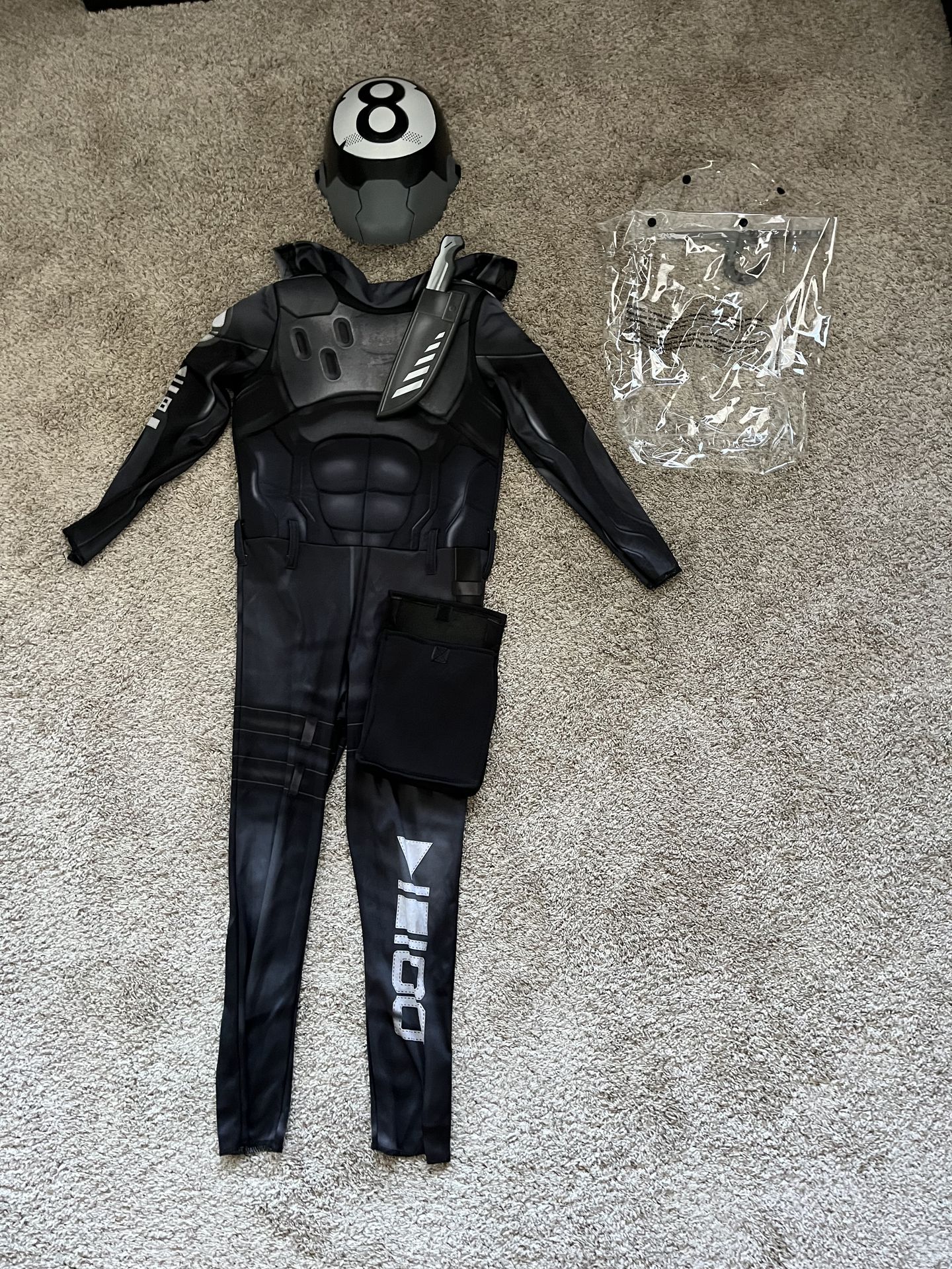 Fortnite 8-Ball Halloween Costume! Perfect for kids who love Fortnite and as a Halloween costume! Only worn once for Halloween and stored away since. Comes With: - 8-Ball Fortnite Body Suit and Attachable Foam Blade and Cloth Pouch (No Rips or Damage) - 8-Ball Fortnite Mask (No Cracks or Damage) Additional Details: - Medium Size - $50 Cheaper Than Original Price ($65 New At Walmart)