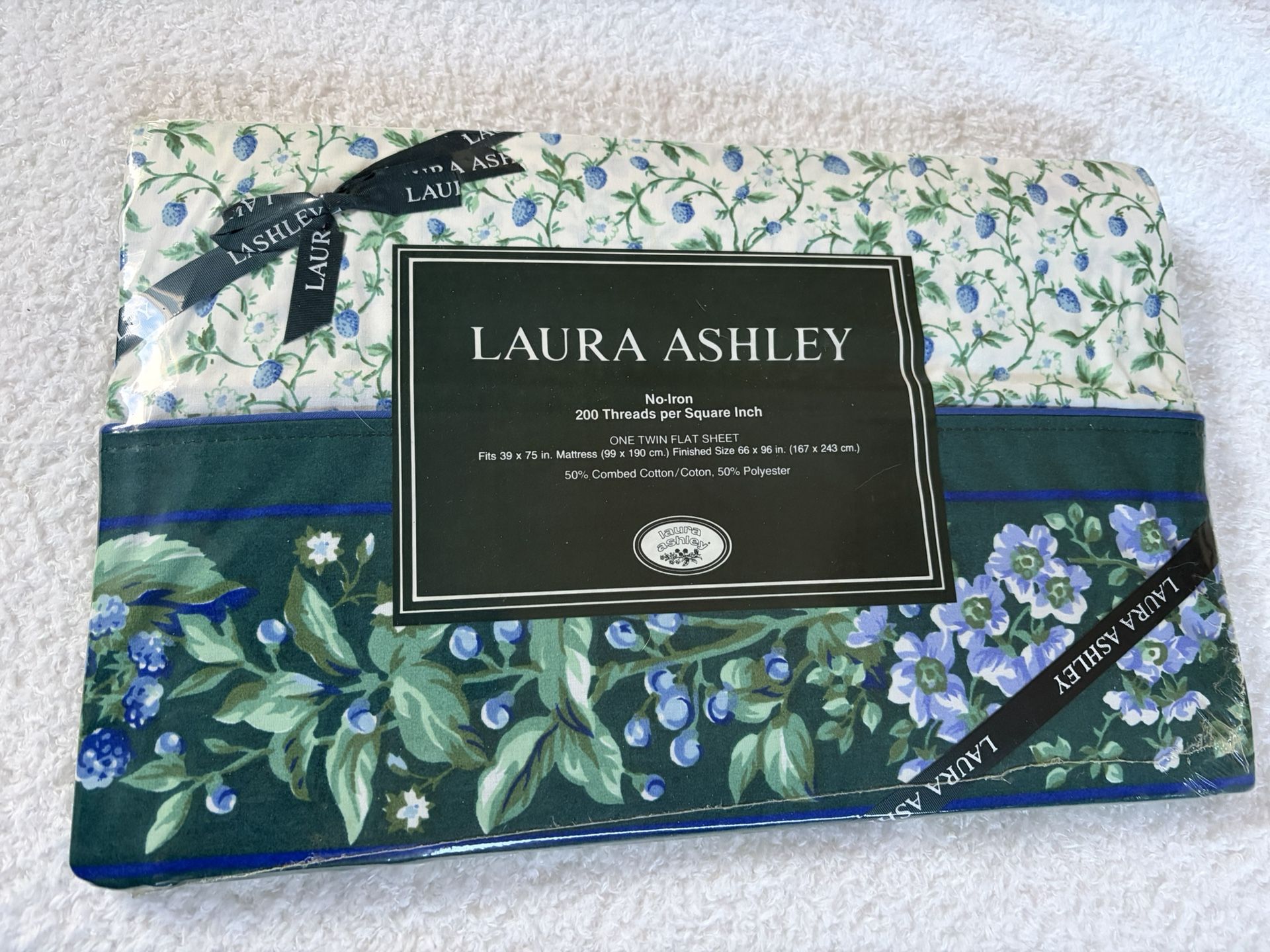 As pictured NEW IN WRAPPING!! RARE! Laura Ashley Bramble Vine NEW & SEALED NIP Twin Flat Sheet DEAD STOCK On EBay $64.99 plus $8.71 shipping.