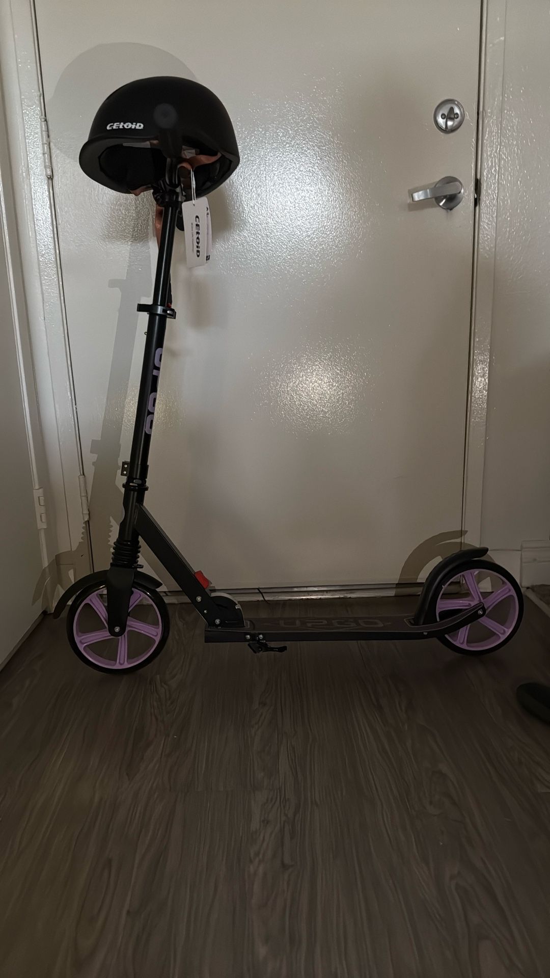Black and purple scooter that is built for up to 200lbs capacity. Scooter has been used a handful of times and the Medium sized helmet is brand new. Scooter can be folded in half for easy storage and the handles detach as well. Also have a scooter chain with key that is new as well.