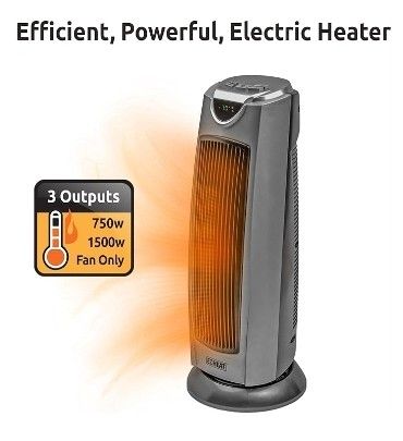 PRACTICAL AND POWERFUL HEATING: The 1500 Watt tower heater is equipped with an extra-large ceramic PTC heating element, providing efficient and powerful heat. With two heat settings to choose from, along with a fan-only setting, this heater offers versatility to suit your specific heating needs. OSCILLATION FEATURE: With its 90-degree oscillation feature, this heater ensures wide coverage throughout the room, spreading warmth to every corner. Experience cozy comfort no matter where you are, as the oscillation helps distribute heat evenly and efficiently. Great for small to mid-sized rooms. INCLUDED SAFETY FEATURES: The integrated safety overheat protection sensor ensures that the heater does not exceed safe temperature levels. The safety tip-over switch instantly cuts power if the unit is accidentally knocked over. The stay-cool body, equipped with a molded handle, allows for safe and comfortable transportation from room to room. COMPACT AND POWERFUL: This versatile tower space heater stands 21.5" tall and 9.5" inches wide making it perfect for use on the floor in your home or office. Heating Coverage: up to 300 Sq. ft