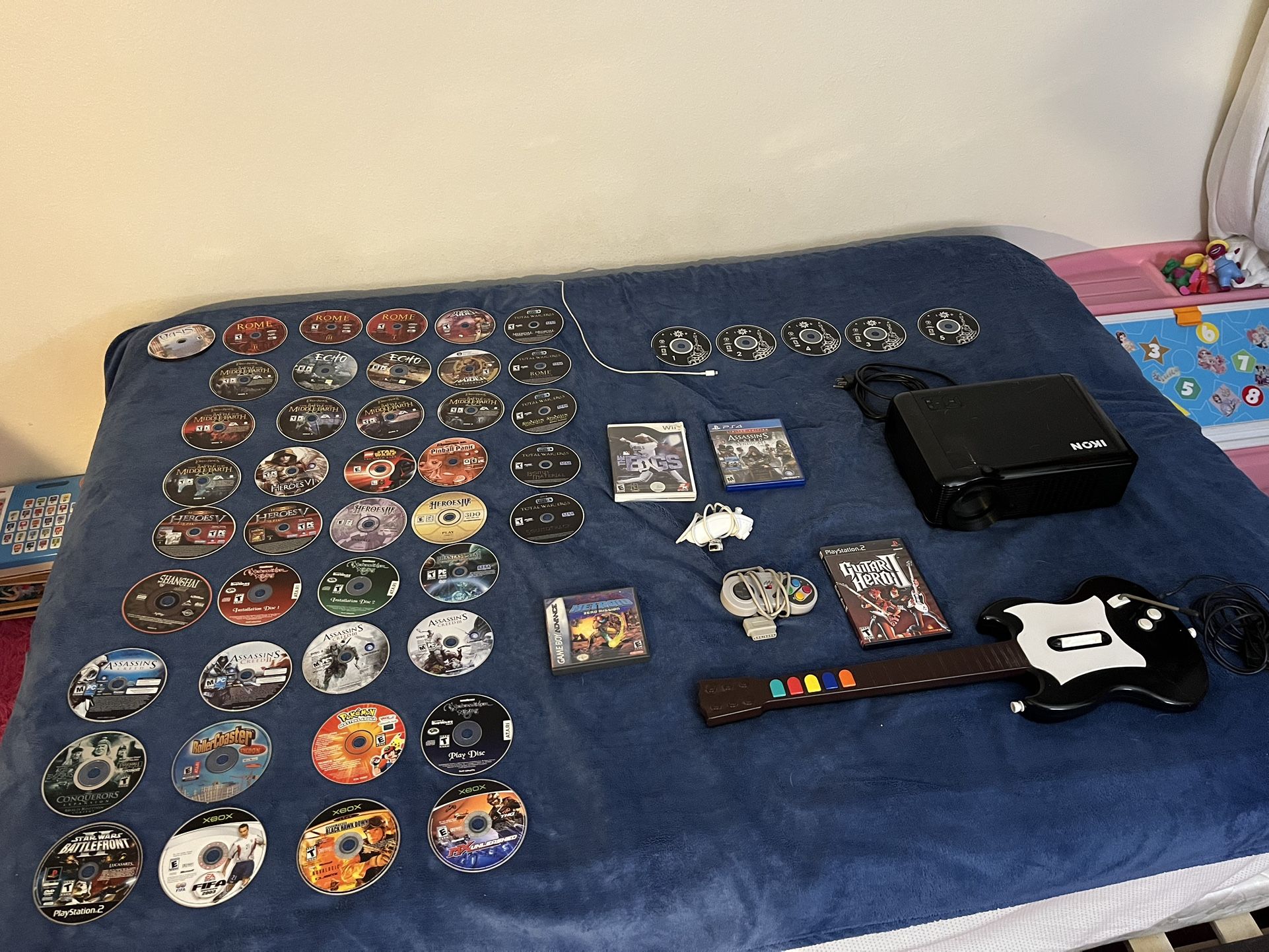 Ps2 guitar (Works fine but have to press hard buttons) Projector works good! Metroid zero mission box only (Heavy water damage) Pc games in good shape Wii ps4 video games