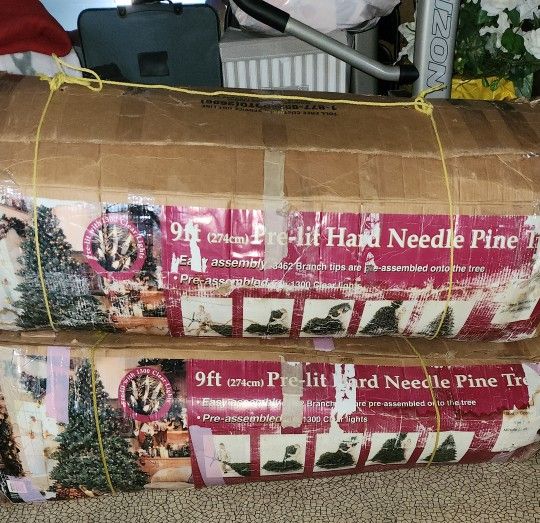 9ft Christmas tree for sale. This a 4 piece pre assembled tree in 2 worn but original boxes. Tree is still in good condition. Pre lit lights need trouble shooting. Measures 9ft high and approximately 5ft wide at its widest point. Heavy duty, foldable 3 ft base. Instructions included. Ornaments Not Included. Free local/reasonable delivery.