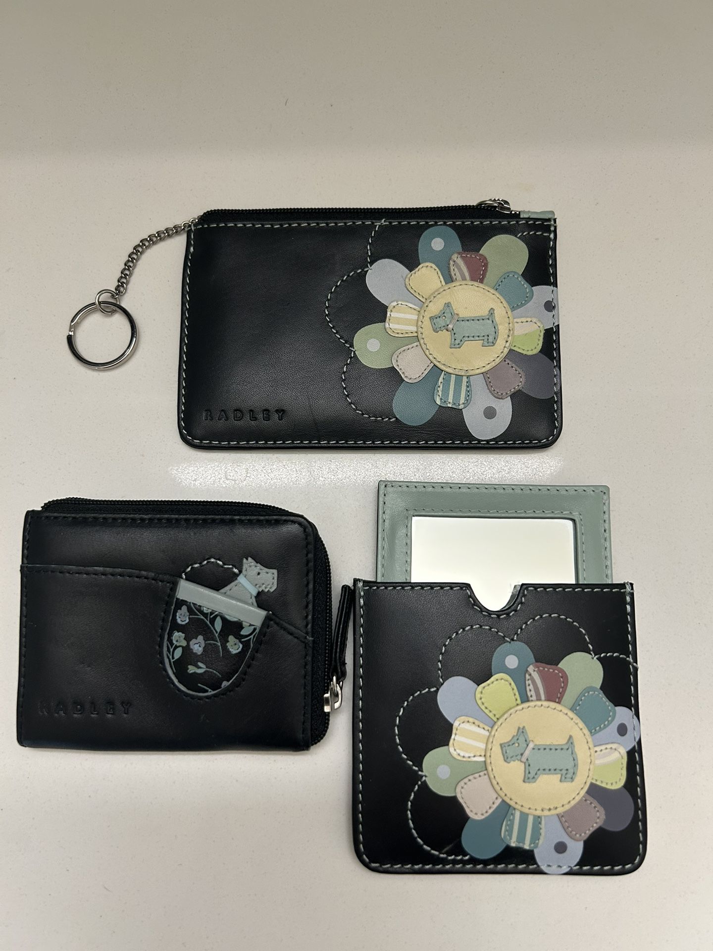 Radley London black leather card case with key holder, coin purse and mirror case with charming famous Radley dog and flower details. Lined with floral fabric. Card case measures 5”W x 3.25”H, mirror case 3.5”W x 3.25”H, coin case 3.5”W x 3”H. Mirror case shows no sign of wear, the other 2 very minor signs of wear. All clean inside.