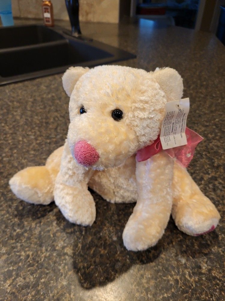Cream plush bear 8" stuffie with pink nose, paws, ribbon Pick up 5 miles west of Janesville Can meet westside Janesville