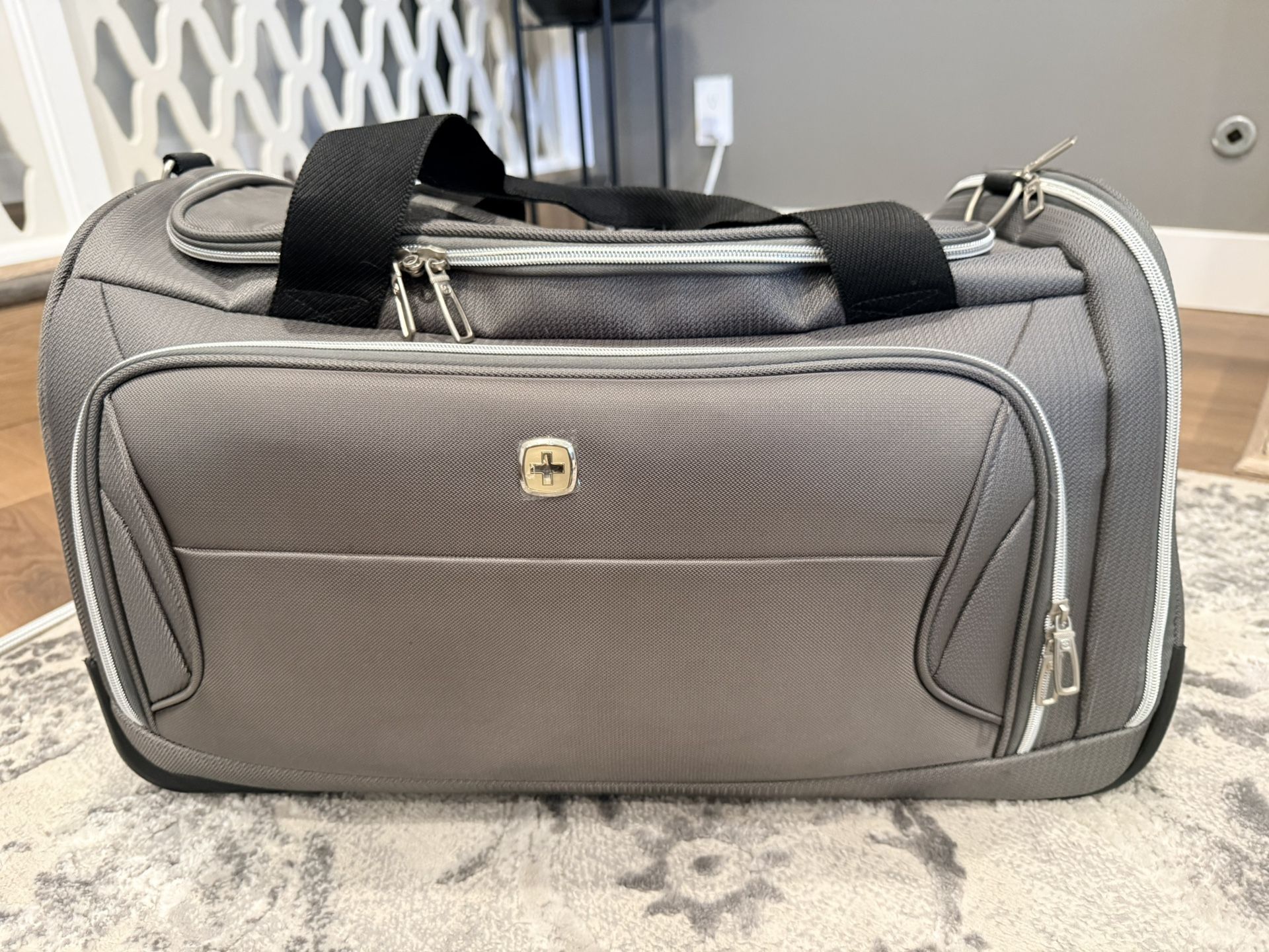 SwissGear Zurich Rolling Duffle Bag Rugged 1200-denier polyester construction 22” bag is an ideal carry-on size Two quite in-line wheels Push-button retractable handle with comfort grip Fully lined, spacious interior Several interior and exterior organization pockets Convenient clip-in cosmetic wet pouch Padded adjustable shoulder strap