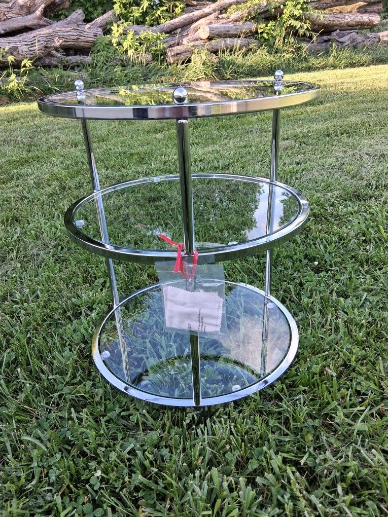 New 3 round durable glass shelf accent table, with metal legs & surrounding, with a beautiful chrome finish