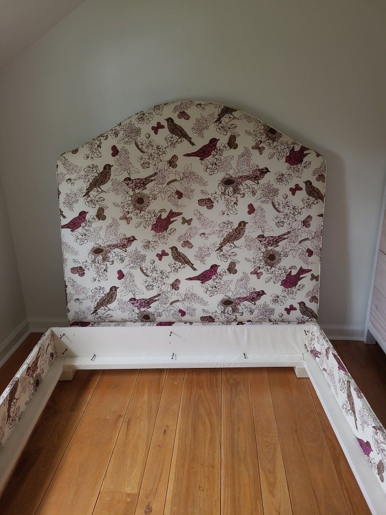 Custom made by Queen Anne Upholstery Full bed base with attached Upholstered headboard stands about 5 feet at highest point. Colors are a dark magenta, pale plum and brown on beige linen. Lilac, birds, nests, butterflies. Darling girls room focal.