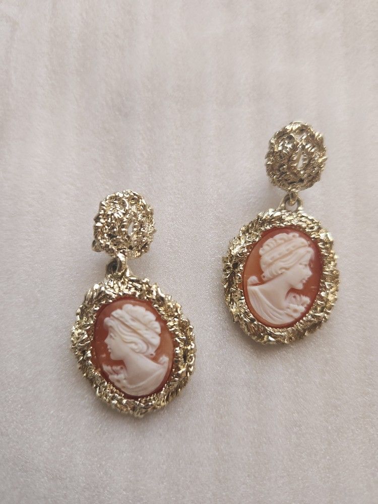 Amedeo NY Designer Shell Carved Lady Silhouette Cameo Dangle Drop Earrings Post earrings