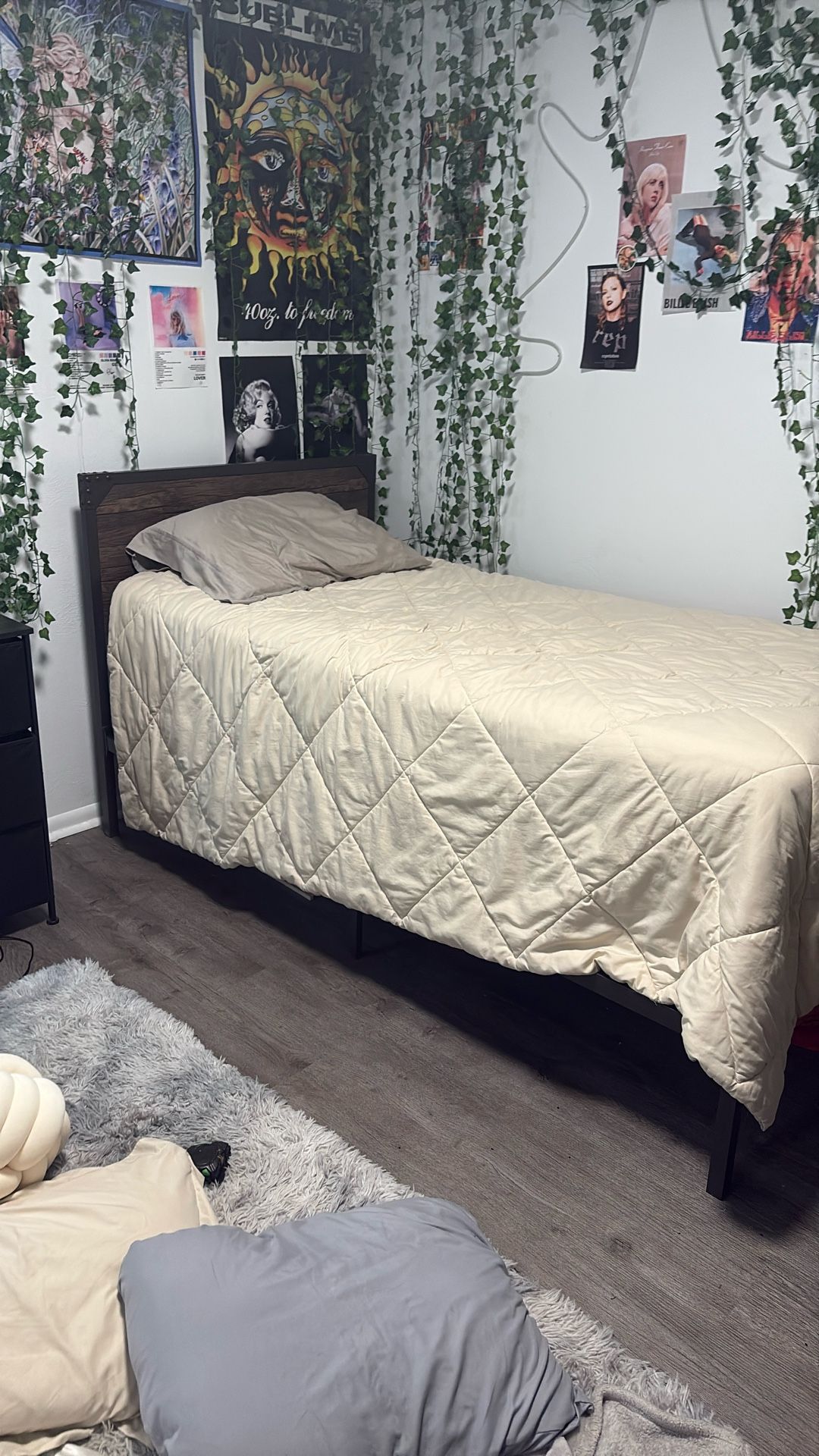 Twin bed frame. Lightly used for about a year. No dents/damages. No instructions included but pretty easy to construct. Metal/wood head board.