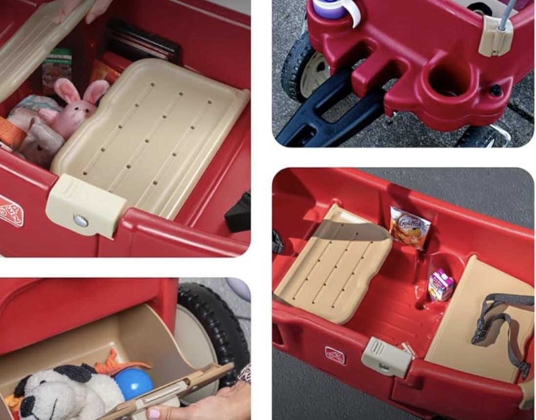 Red wagon great for Christmas or riding around the neighborhood to see the holiday lights. 2 seats with seatbelts , lots of storage for toys cups and essentials