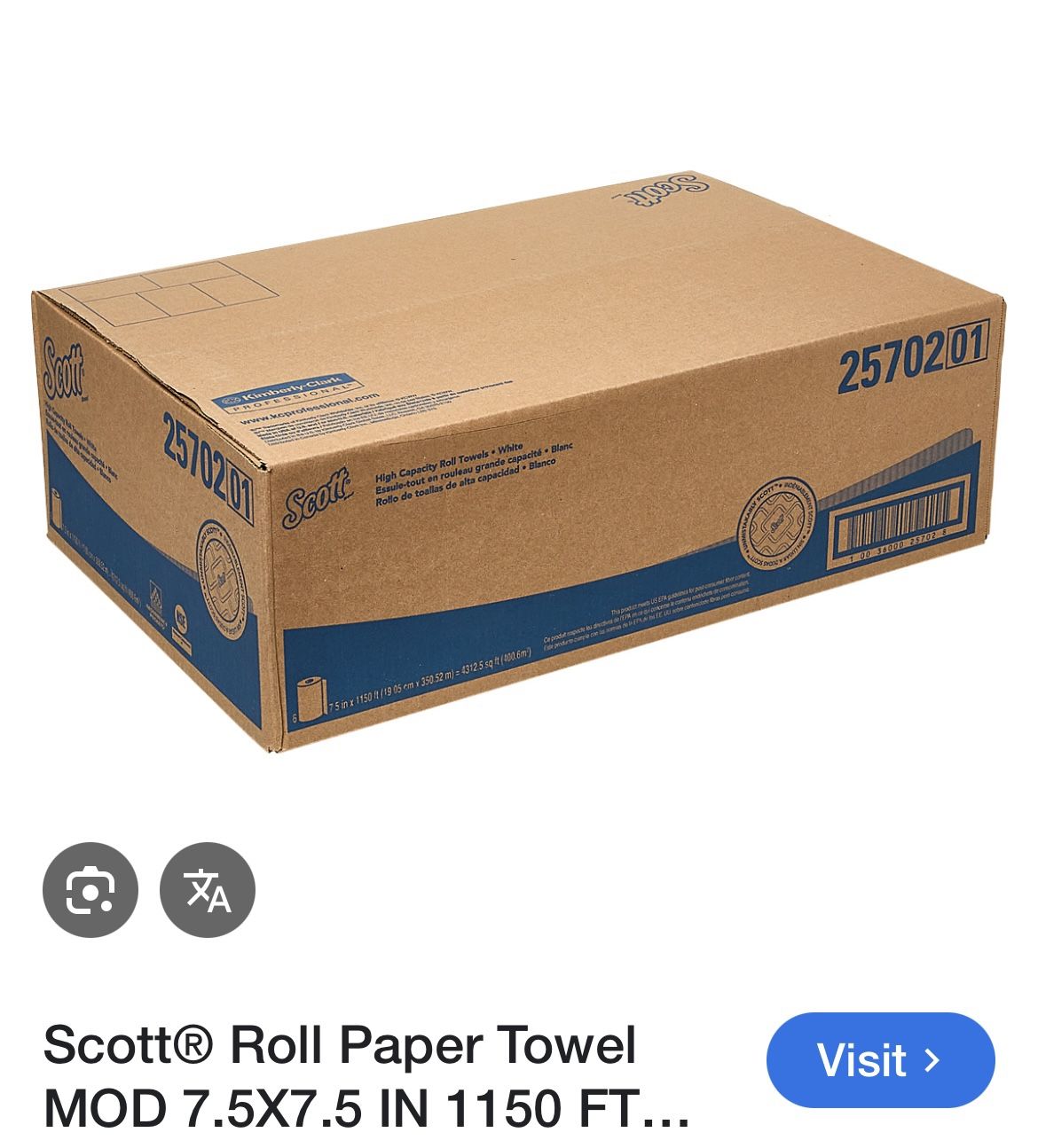 Kimberly Clark Scott Towel number # 25702. white 6 rolls to a case 7.5” x 1150 ft Scott® Pro™ provides state-of-the-art solutions to maximize productivity. Scott® Pro™ High-Capacity Hard Roll Paper Towels provide efficient, reliable hand-drying for your washroom or break room. With the new paper design, our paper towel is Unmistakably Scott® branded so you'll be recognized for providing the most well-known restroom brand in your facility. This new Elevated Scott® Design was preferred 4 to 1 based Will not find anywhere a better deal than this not many left so get them as soon as you can