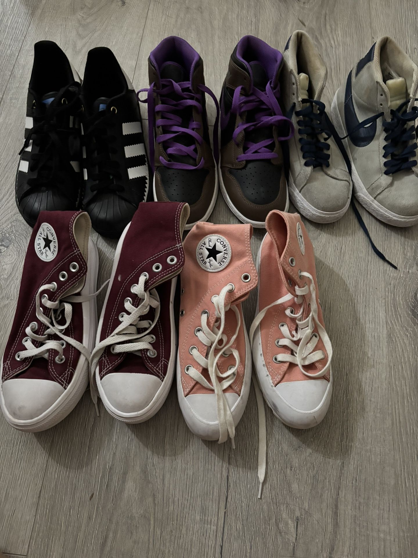 Nike blazers women size 5.5 Nike Jordan’s women size 7 Light pink converse women size 7 Burgundy converse women size 7 Adidas superstar men size 7