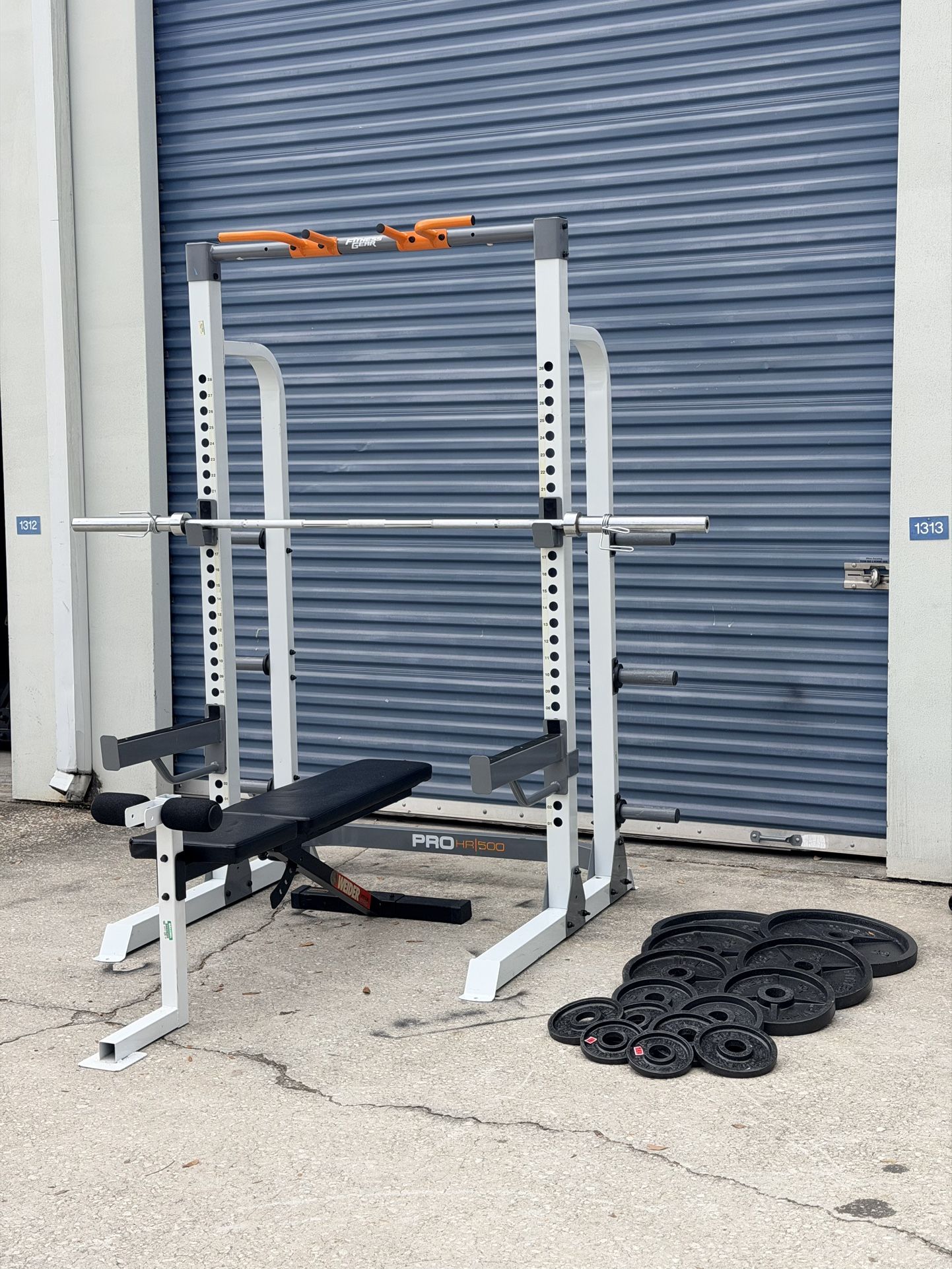 Fitness gear Pro HR 500 Home gym/ garage gym set In great condition! Half rack W safety squat bars Adjustable bench 7ft bar 255lb of Olympic weights 2-45 2-35 2-25 2-10 4-5 2-2.5 This is a fantastic home gym set/ garage gym set