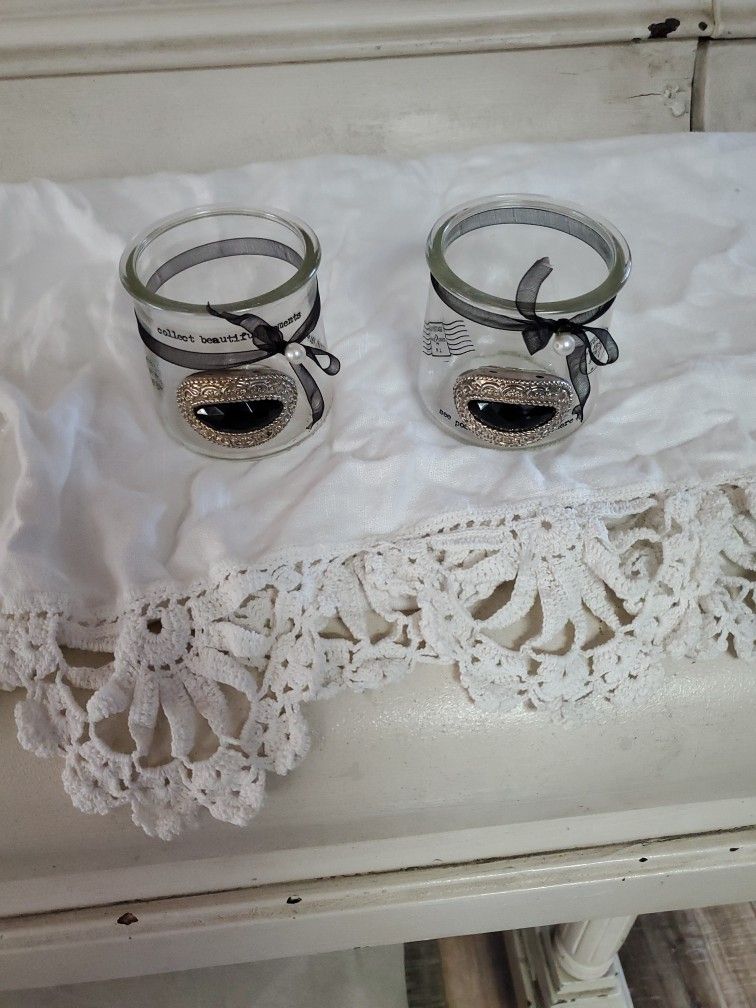 2 jeweled jars for $2.00. Use for candles, money, plants, Q-tips .....approximately 2.5" across x 3" tall. Handmade by me. If you are looking at this post then it's still for sale. Thank you for looking. Have a great day.
