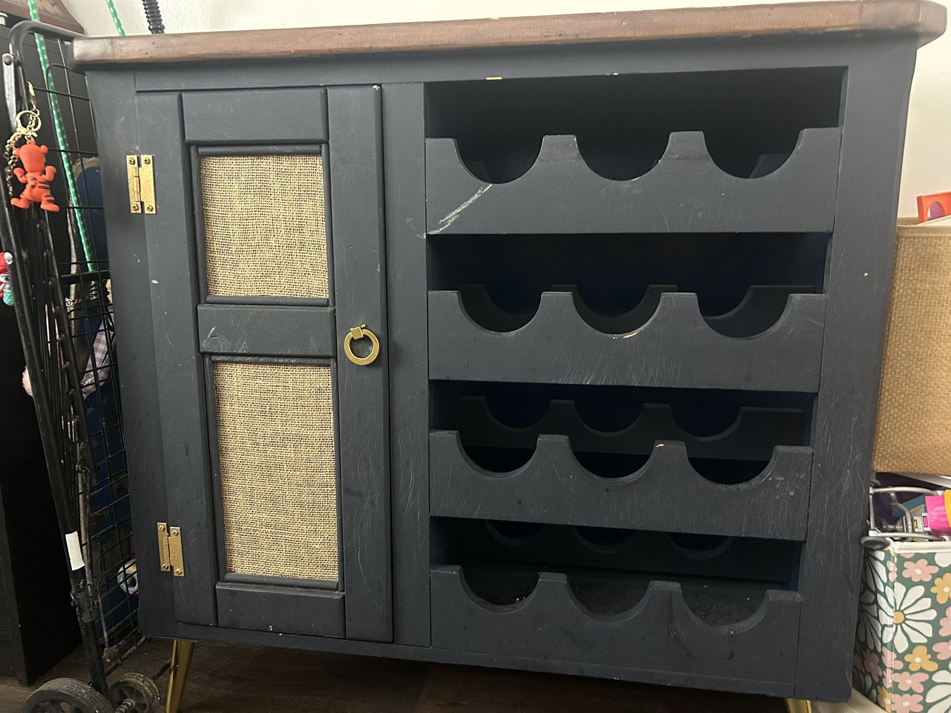 Navy blue wine rack with cabinet , a couple scratches but works great , pretty decent size .
