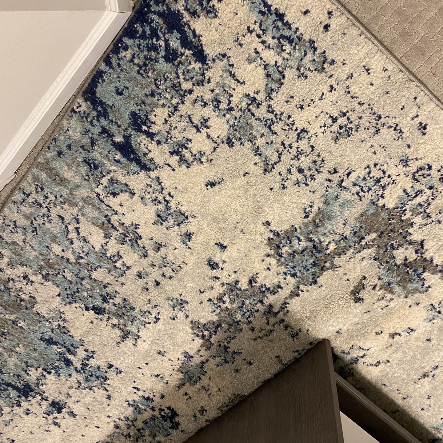 Area rug with blue gray and white. Abstract modern contemporary area rug.