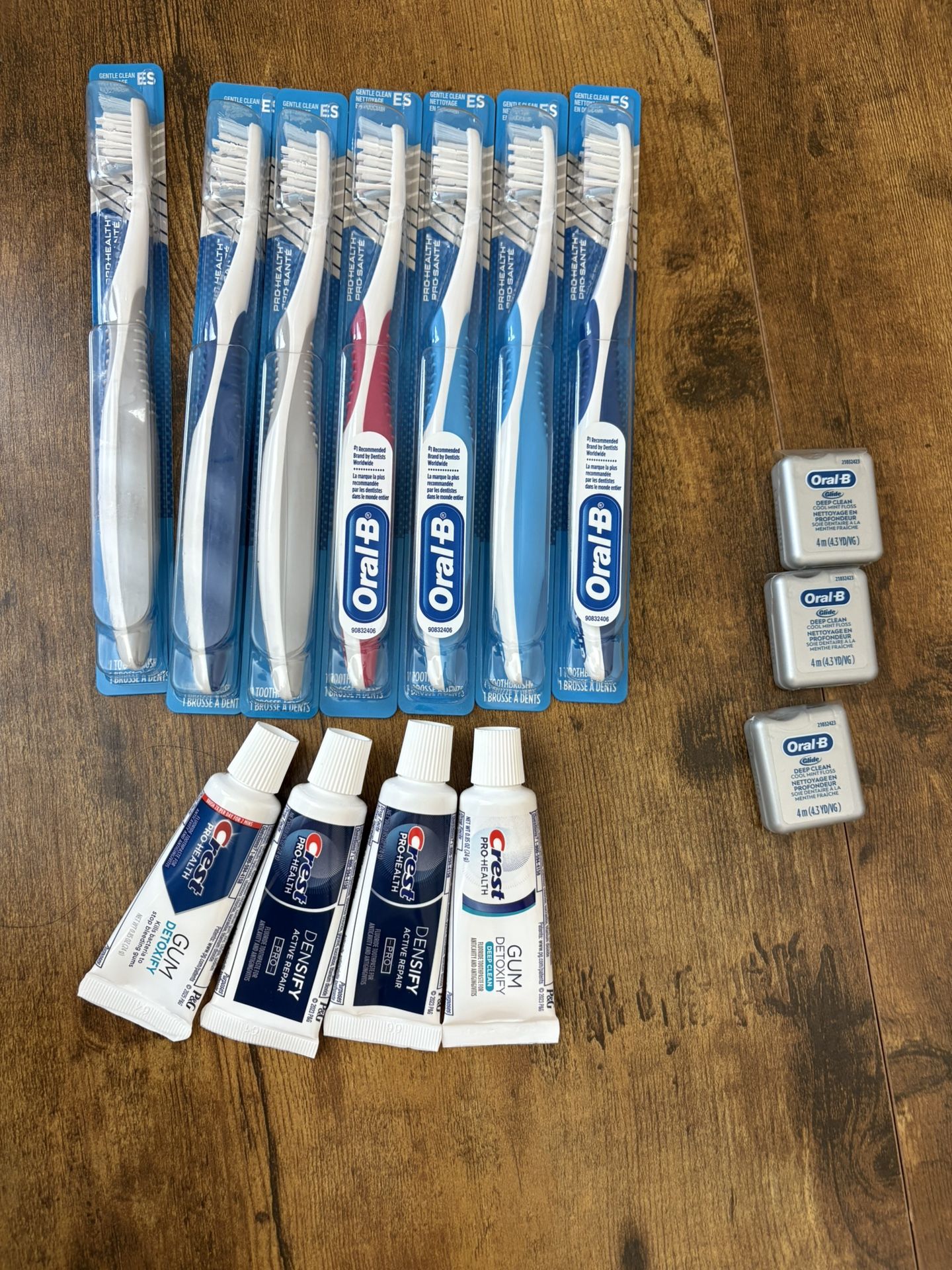 Oral-B Toothbrush Set + Crest Travel Toothpaste & Floss – 14 Pc Dental Care Kit Includes: • 7x Oral-B Pro-Health Toothbrushes (Gentle Clean, Individually Sealed) • 4x Crest Pro-Health Travel Size Toothpaste (0.85 oz each) – Gum Detoxify & Densify formulas • 3x Oral-B Glide Dental Floss (4 m / 4.3 yds each) Perfect for: • Travel, Guest Bathroom, Emergency Kits, Daily Use • Trusted brands: Oral-B & Crest All items are new and unused. Toothbrushes are in original packaging; toothpaste and floss are travel-size, ideal for on-the-go.