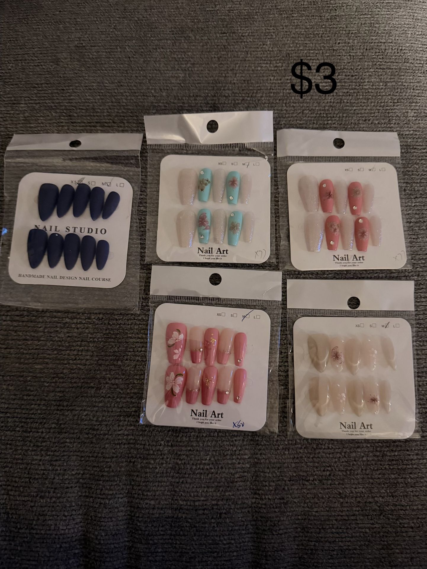 Clearing out my handmade nail collection. Each set is brand new, never worn. Prices are $2-$10 per set (see photos). I'm open to reasonable offers and just want to cover my costs. Each set comes with nail prep.