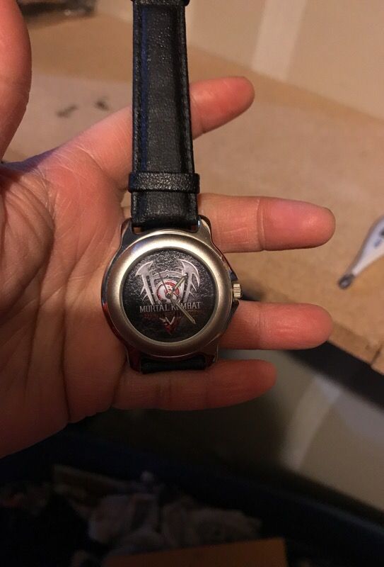 Mortal Kombat watch. Leather Band. Stainless steel watch. Battery dead but you can always change it. You’re not a real fan unless you have the watch. Haha. Watch is more than 10 years old and still in great condition. Add this to your collection.
