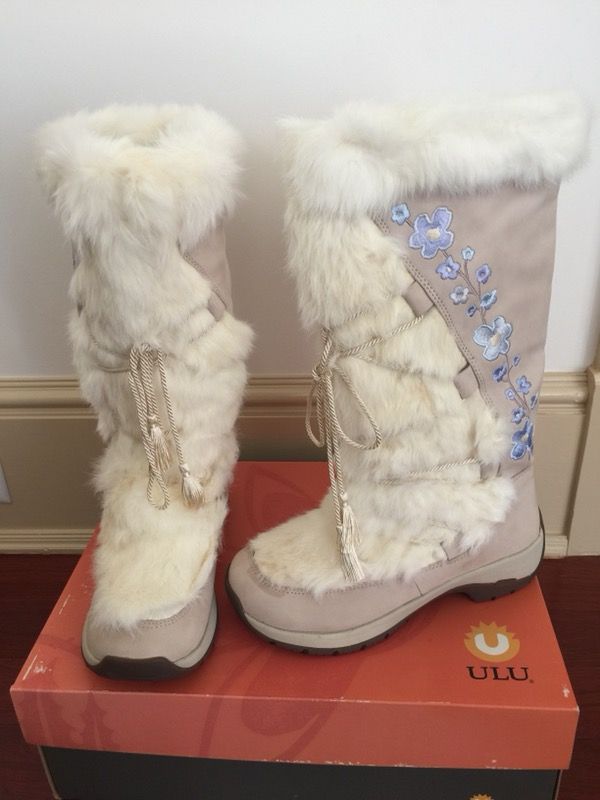 Water Proof snow boots in Winter White with rabbit fur trim and light blue embroidery on the side of the boot with a front tassel. Never been worn, still in the original box.