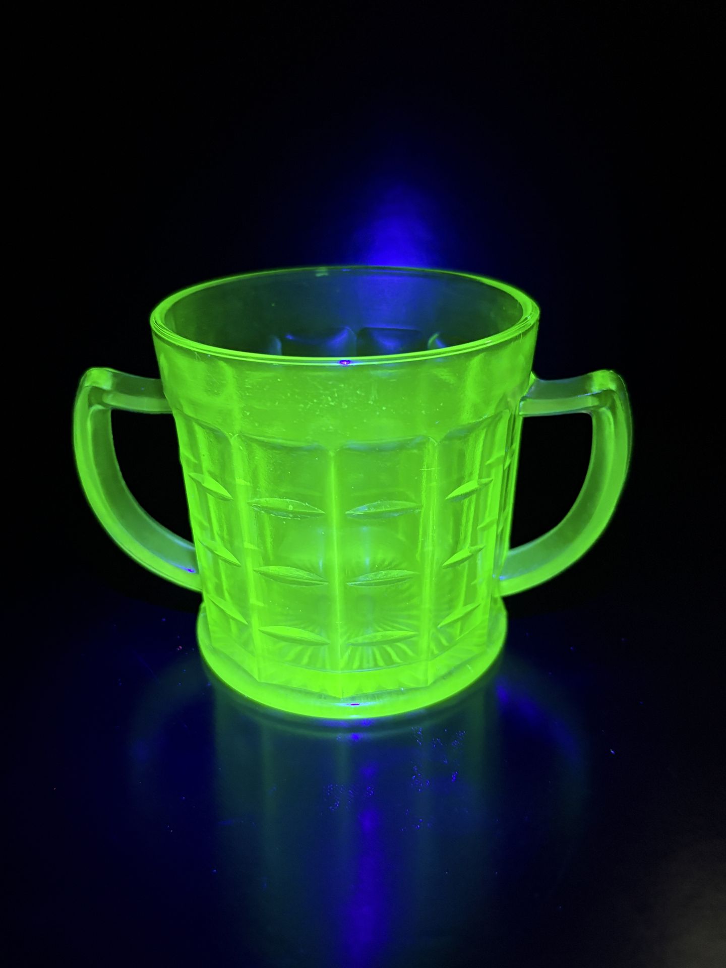 Vintage Hazel Atlas Colonial Block Green Depression Uranium Dual Handled Cut Glass Sugar Bowl In excellent condition 4” high by 4” wide