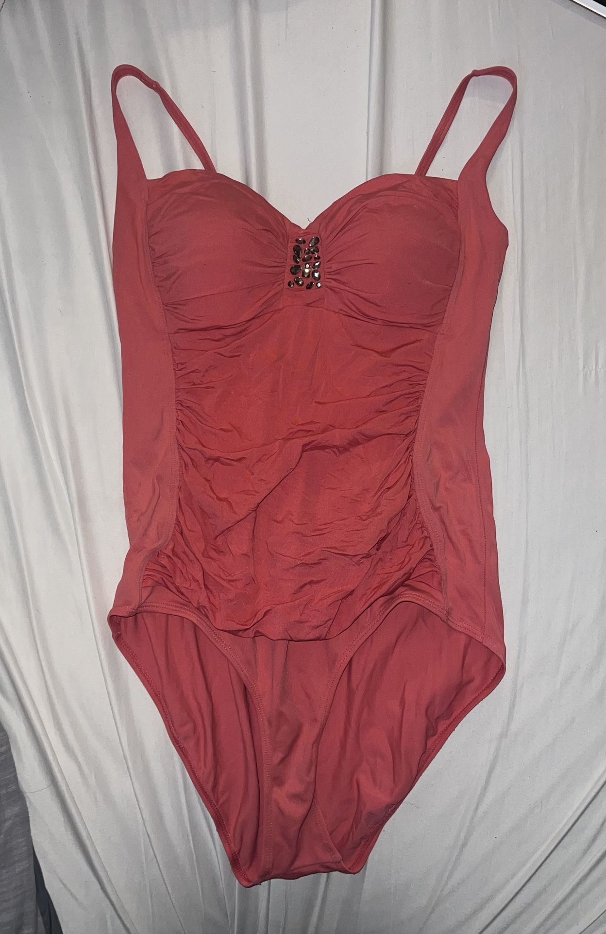 Plus size friendly swimsuit, with tummy control & ruched in the stomach area. Light wear in the bottom, as pictured.