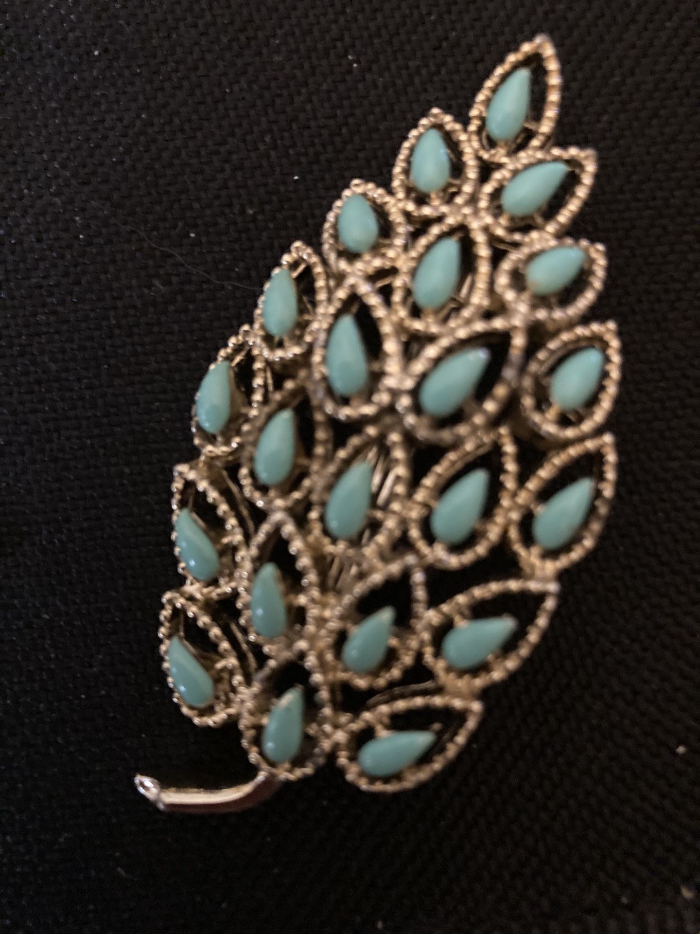 Beautiful Vintage 1960’s Gold Tone Brooch with faux turquoise leaf pin