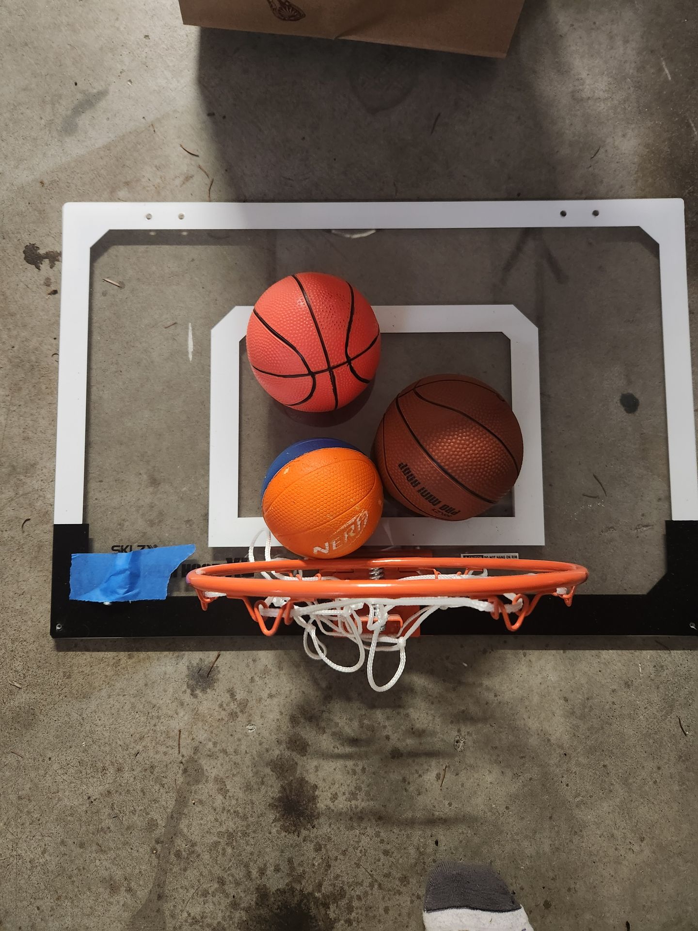 Wall mounted basket ball hoop. Included the balls shown in picture as well as mounting screws. In excellent condition. Dimensions are listed on photos. Pick up only. Cash only. Woodinville..Maltby side.