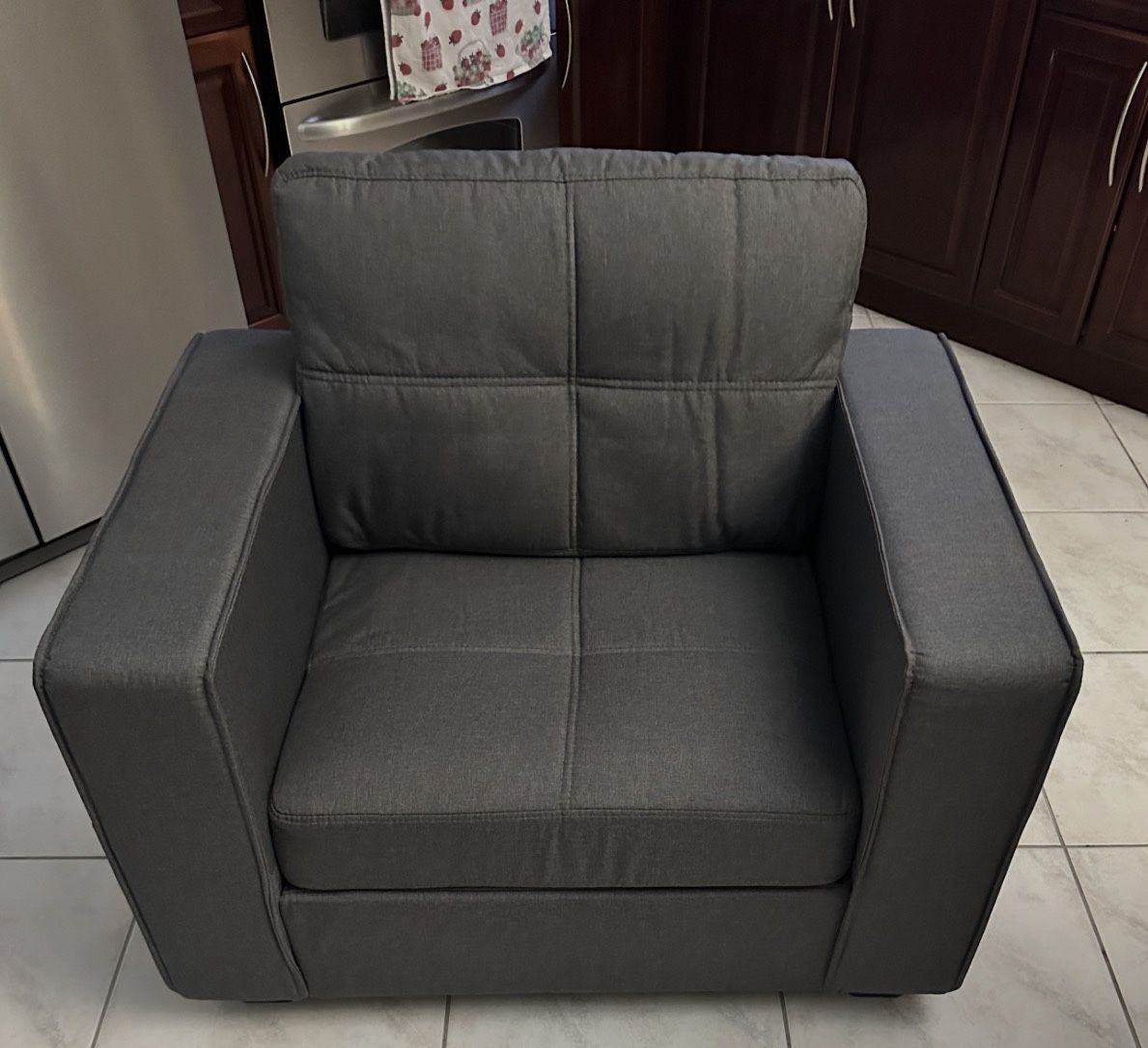 NEW AND NEVER USED BIG TUFTED CHAIR GREY COLOR COMES APART FOR EASY FIT IN A CAR Overall Chair Dimension 32.28'' H X 38.58'' W X 27.55'' D Legs 3.15'' H Overall Seat Dimension 16.93'' H X 25.98'' W X 19.68'' D Seat Back Dimensions 18.50'' H Overall Product Weight 44 lb. Arm Height - Floor to Arm 24'' H Features ELEGANT DESIGN: This sofa shape combines comfort and elegance, with tufted upholstery lines that avoid visual fatigue without being monotonous. Whether you put it in your bedroom, living room, game room or office, it will brighten up the bare corners as well as add texture to your space. EXCELLENT SUPPORT: Thick and short square legs, natural solid solid wood frame, and thick and highly resilient cushion ensure a sturdy and comfortable seat. Its core strength lies in the high resilience foam for superior support, while the back cushion is filled with fluffy doll cotton, and the entire back cushion is ergonomically shaped and designed to make your body feel more comfortable, so you can use it as a reading chair to relax or read. LUXURIOUS SOFTNESS: The sofa is made of skin-friendly fabrics that are soft and delicate to the touch, making you feel as if you are sitting on a cloud. In addition, its excellent stain and mold resistance makes cleaning and maintenance a breeze.