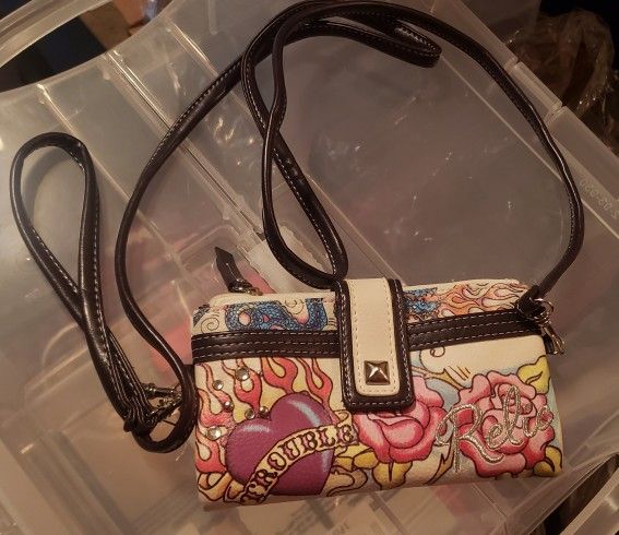 RELIC Purse Wallet Crossbody. Relic wallet with words Heart Breaker and Trouble written on it. 2 zippered compartments, slots for license and credit cards, space for checkbook, leopard interior print, outer synthetic leather. Snap closure, Front pocket. Measures 7” long by 4” wide Multi-color. Item is New without tags. $40.00. Cash Only Pick up Only.