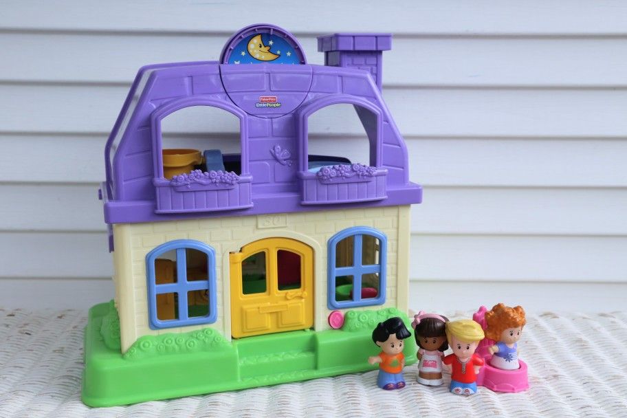 Little People Happy Sounds House/ Purple Cottage Set with Figures - Sounds Work! (Phone, Doorbell, Washer, Tub, Cradle Swings, Night /Day Spinner)
