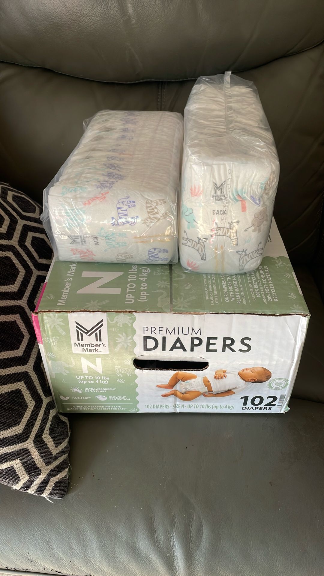 Members mark premium diapers size Newborn 2 brand new packs 34 diapers in each pack will let both packs go for $7. 68 Diapers in total.