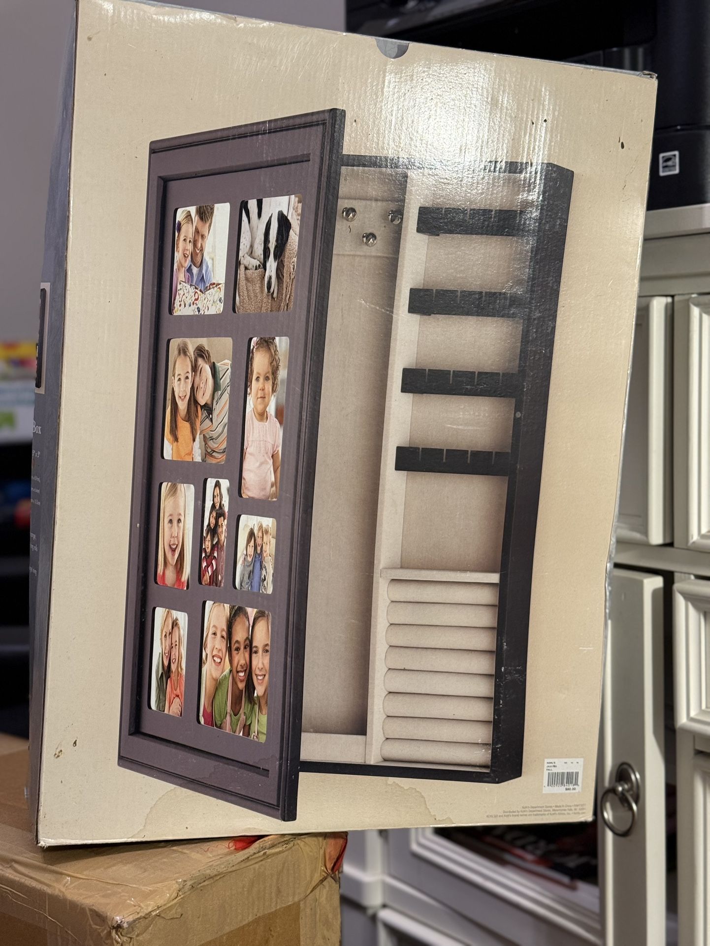 Brand new in the box, never used. opens to necklace hanger, earring holder and ring rolls black finish with beige lining.
