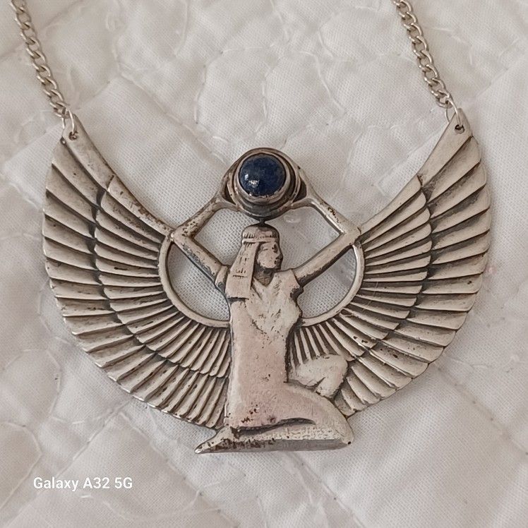 Vtg.Rare STERLING SILVER EGYPTIAN GODDESS IRIS - LAPIS NECKLACE- 17IN.
